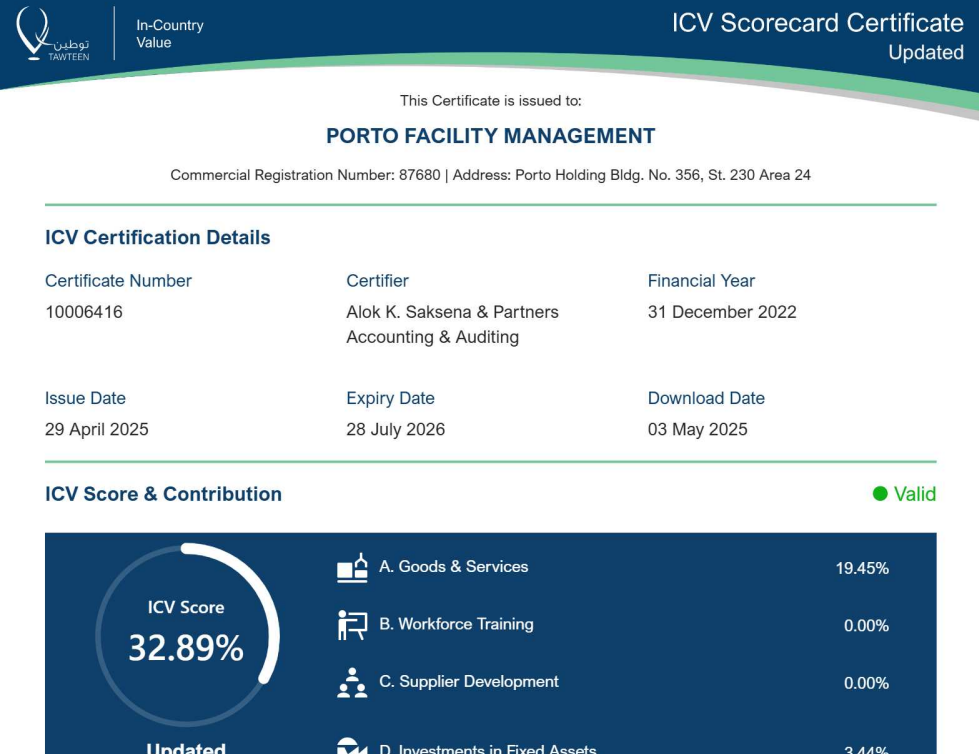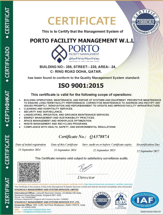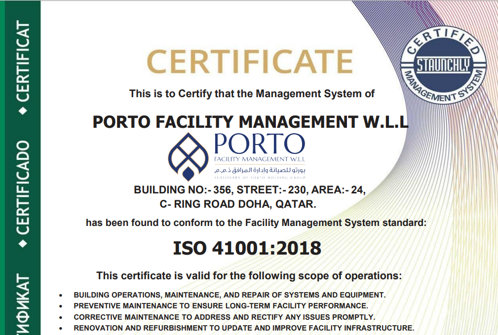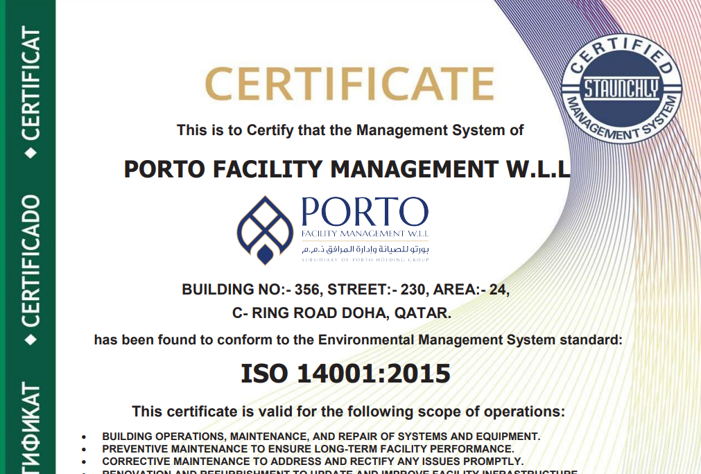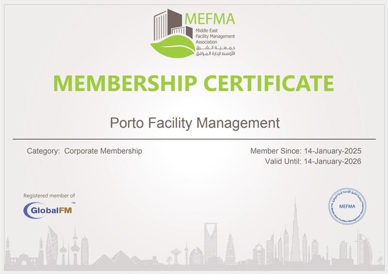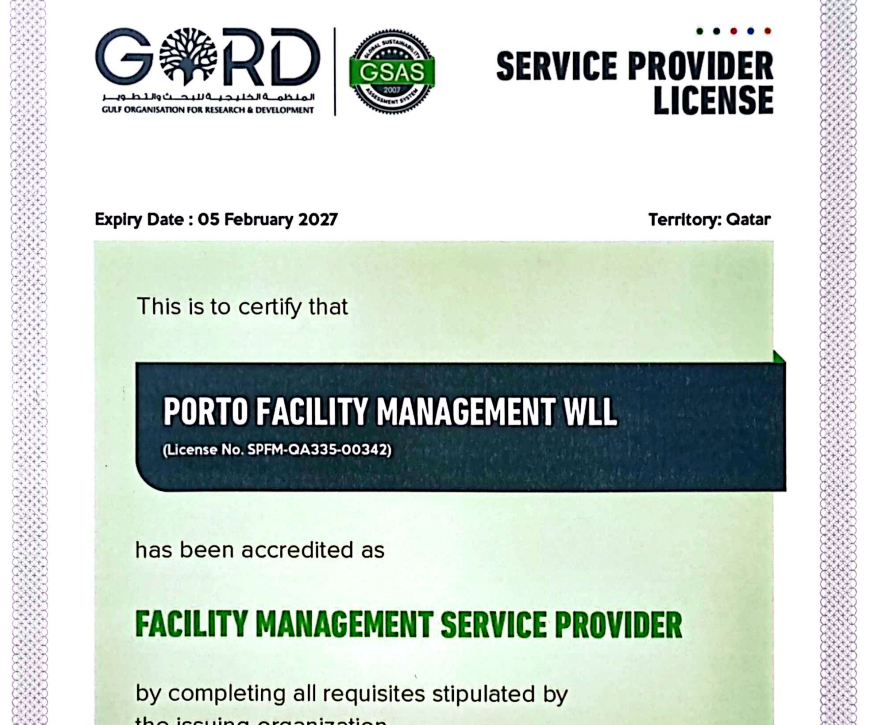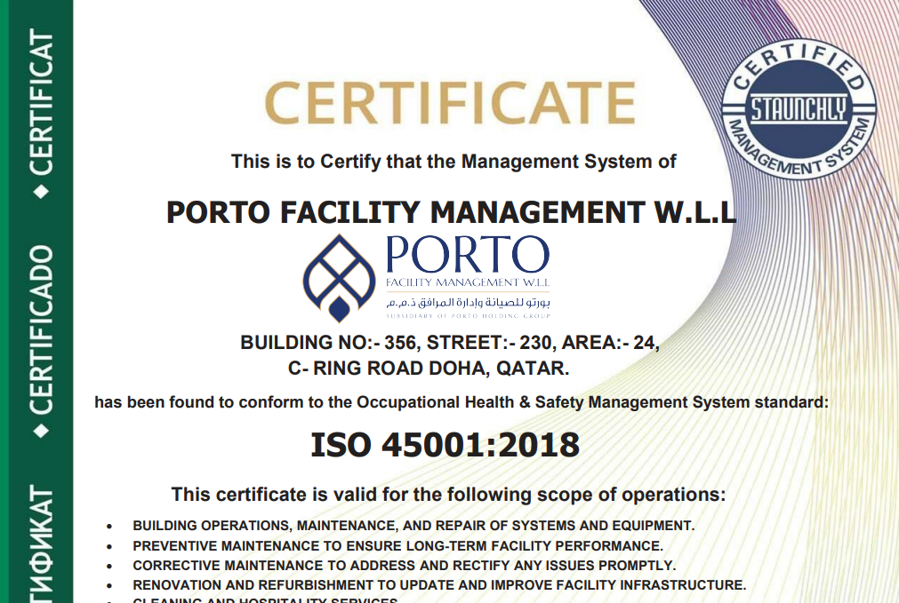 Porto Facility Management W.L.L is proud to be recognized for its unwavering commitment to quality, safety, sustainability, and operational excellence.